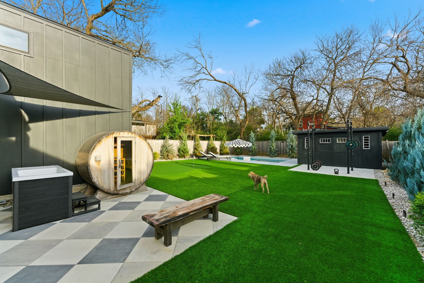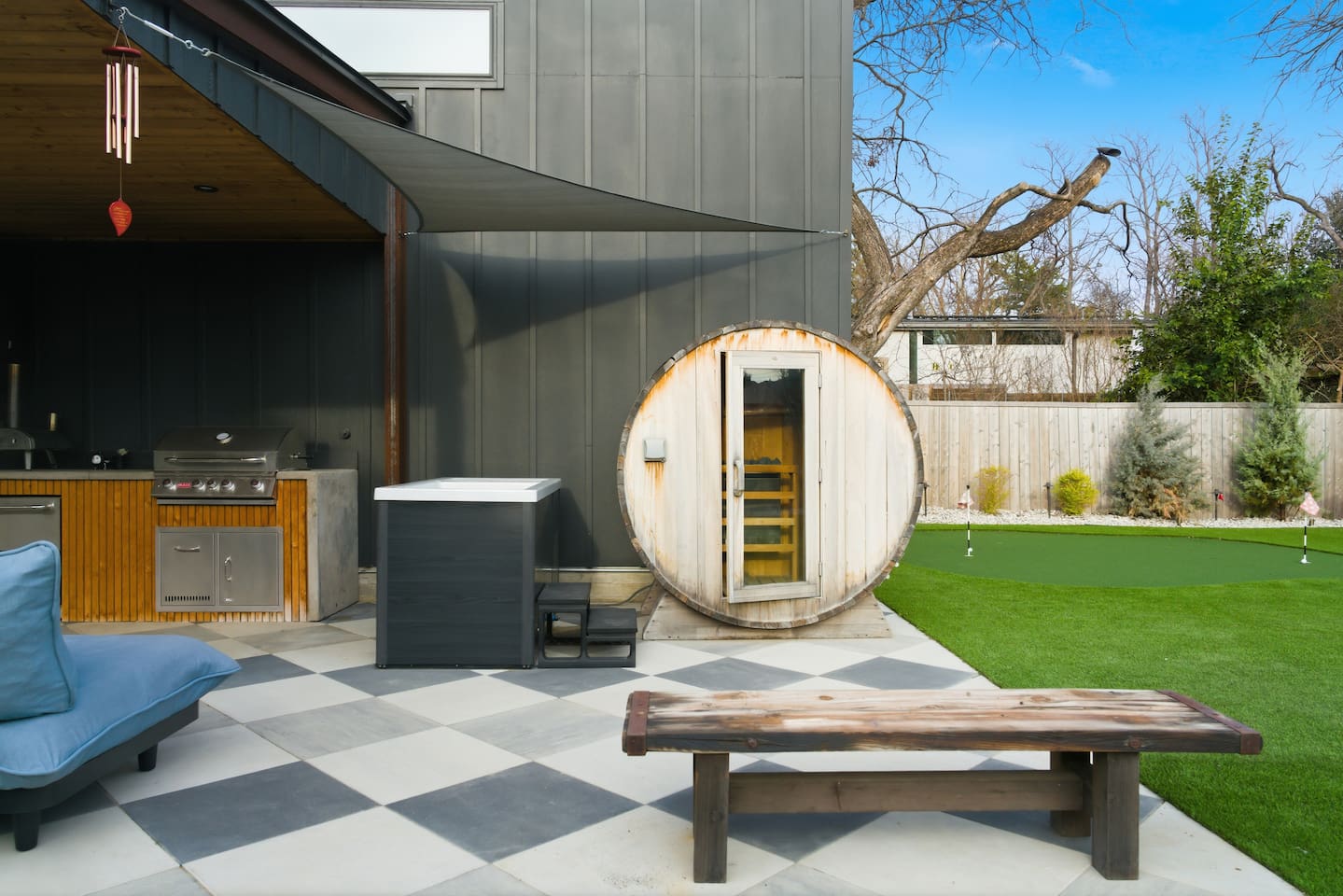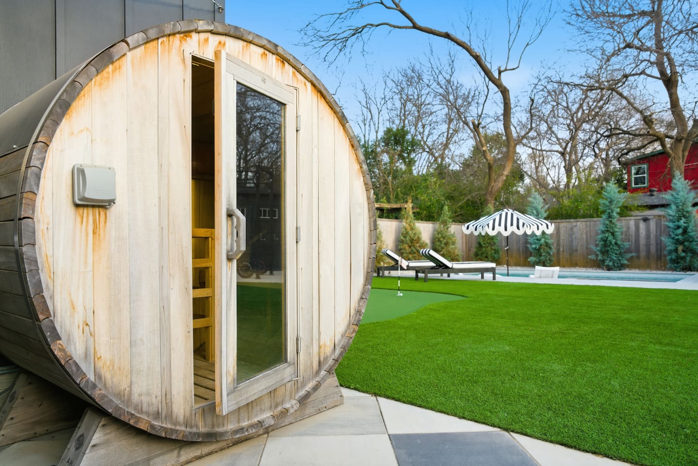 Pool, hot tub, sauna & cold plunge — Dallas's only private wellness retreat with all four, plus outdoor gym and putting green. 3 bedrooms, sleeps 7. Full kitchen, fast WiFi, free parking, keyless entry. Outdoor entertaining station with built-in grill, wood-fired pizza oven & outdoor TV. Smart TVs, dedicated workspace. 15 min from downtown Dallas. Easy access from all major highways. Book your wellness retreat today.