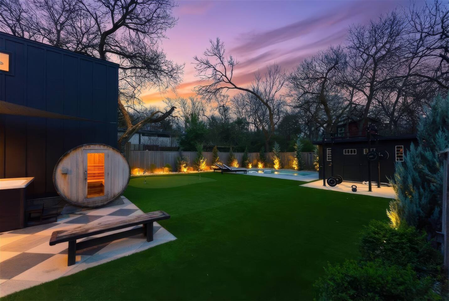 A private, design-forward wellness retreat in East Dallas — minutes from the Dallas Arboretum and easy access from all major highways. Outdoors: heated magnesium pool, hot tub, cedar sauna, cold plunge, putting green, fully equipped outdoor gym, outdoor seating, and an entertaining station with built-in grill, wood-fired pizza oven, cold drawers and outdoor TV. Inside: 3 spacious bedrooms, sleeps 7, full kitchen with new appliances, Smart TVs, dedicated workspace, and fast WiFi throughout. Keyless entry, free parking, and self check-in. The hot tub is heated by default. Pool heating available as a pre-arrival upgrade. All wellness amenities are self-guided.